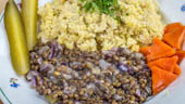 Čočka na kyselo: 2 šálky zelené čočky uvařené s wakame a yzopem, 2-4 cibule (žluté či červené), 1-2 lžíce slunečnicového či sezamového oleje, mořská sůl, 1 vrchovatá lžíce celozrnné pšeničné či špaldové mouky (anebo dvouzrnkové, jednozrnkové či z červené pšenice), kvašáky - kvašené okurky