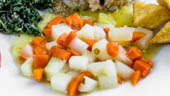 - Červenou řepu nakrájíme na velké kostky a upečeme. Na talíři na ní přidáme nastrouhaný křen.